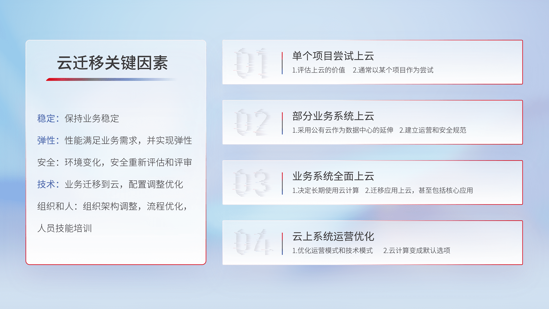 结合实际业务,,从规划设计、、、、云平台选型、、、、云原生改造、、、、数据迁移、、集成交付,,,,迁移全过程为客户识别最佳上云路径,,做好风险识别管理,,设计网络架构、、身份权限、、安全审计合规、、操作审计、、、、日志审计、、、、监控告警策略、、、多站点容灾设计等,,,对云上基础设施进行整体规划,,,提升IT治理水平,,以满足弹性、、、高可用、、、高性能的需求。。。